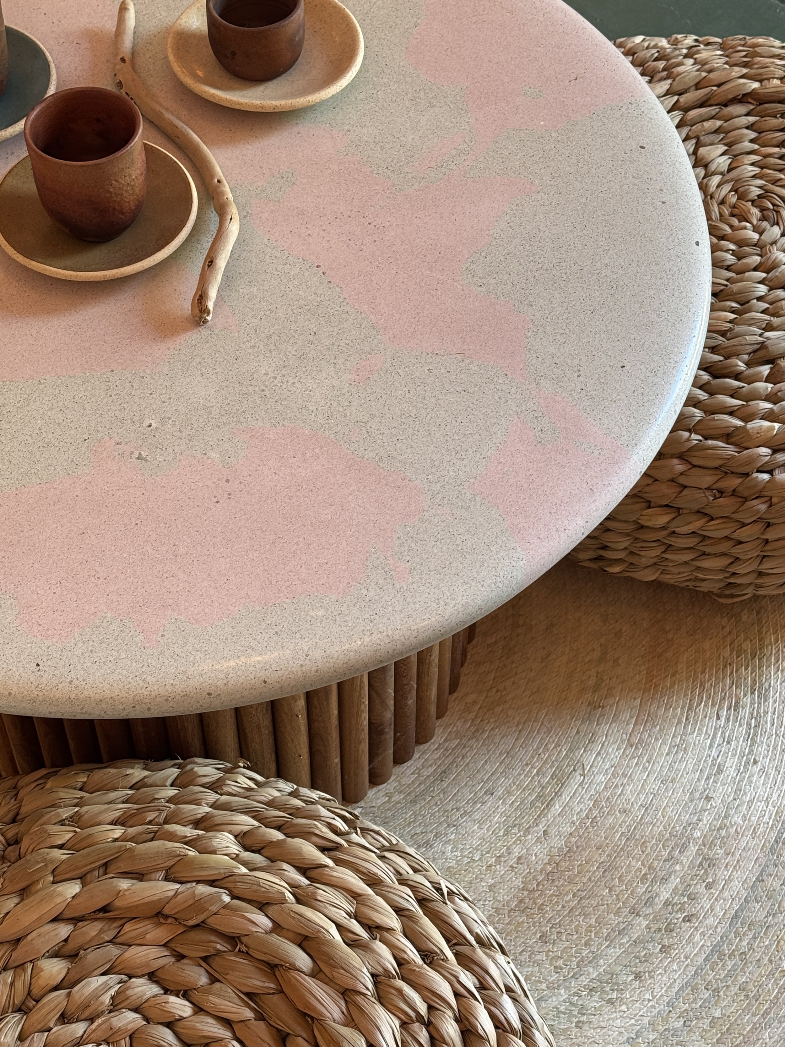 Once the base is set, José designs each piece with different colored concrete, stone, glass, and found object accents. And while José's terrazzo work is remarkable, as with many of the artisans with whom we collaborate, it is not the only medium he works in; he is also an exceptional surfboard shaper and laminator. And so once formed, José then spends hours polishing terrazzo, the result is both stunning and protective.